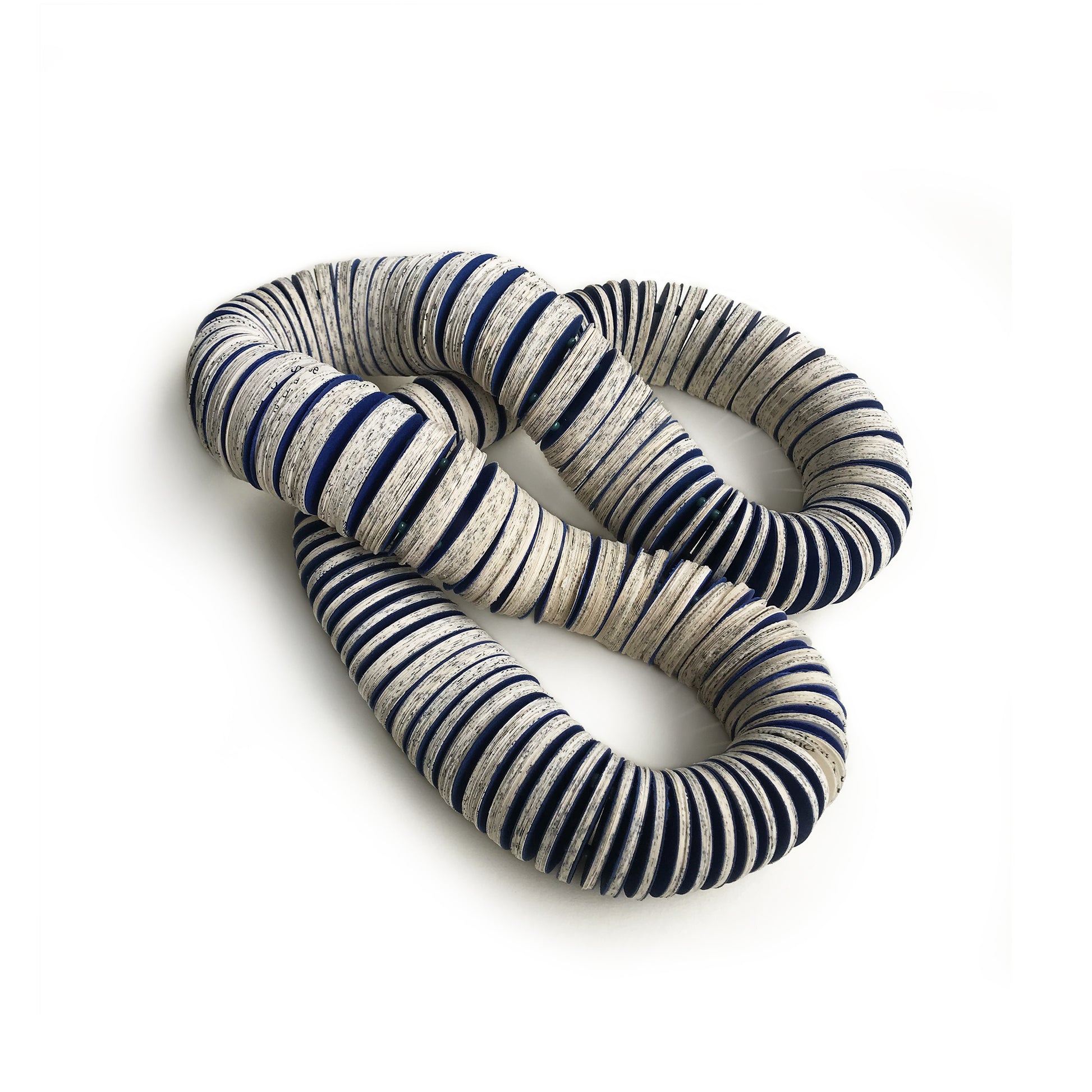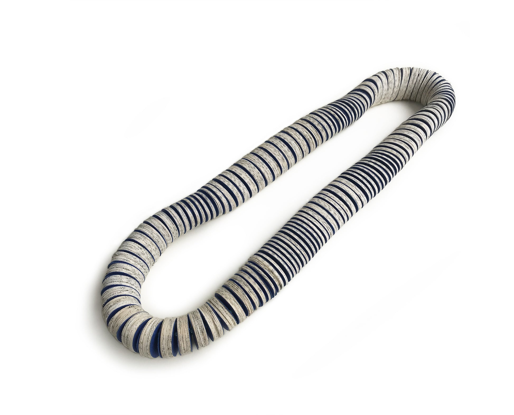 Collana lunga artigianale realizzata con carta riciclata da libri. Design unico con blocchetti ovali a scalare, perline di ceramica e dettagli blu che creano movimento e profondità.