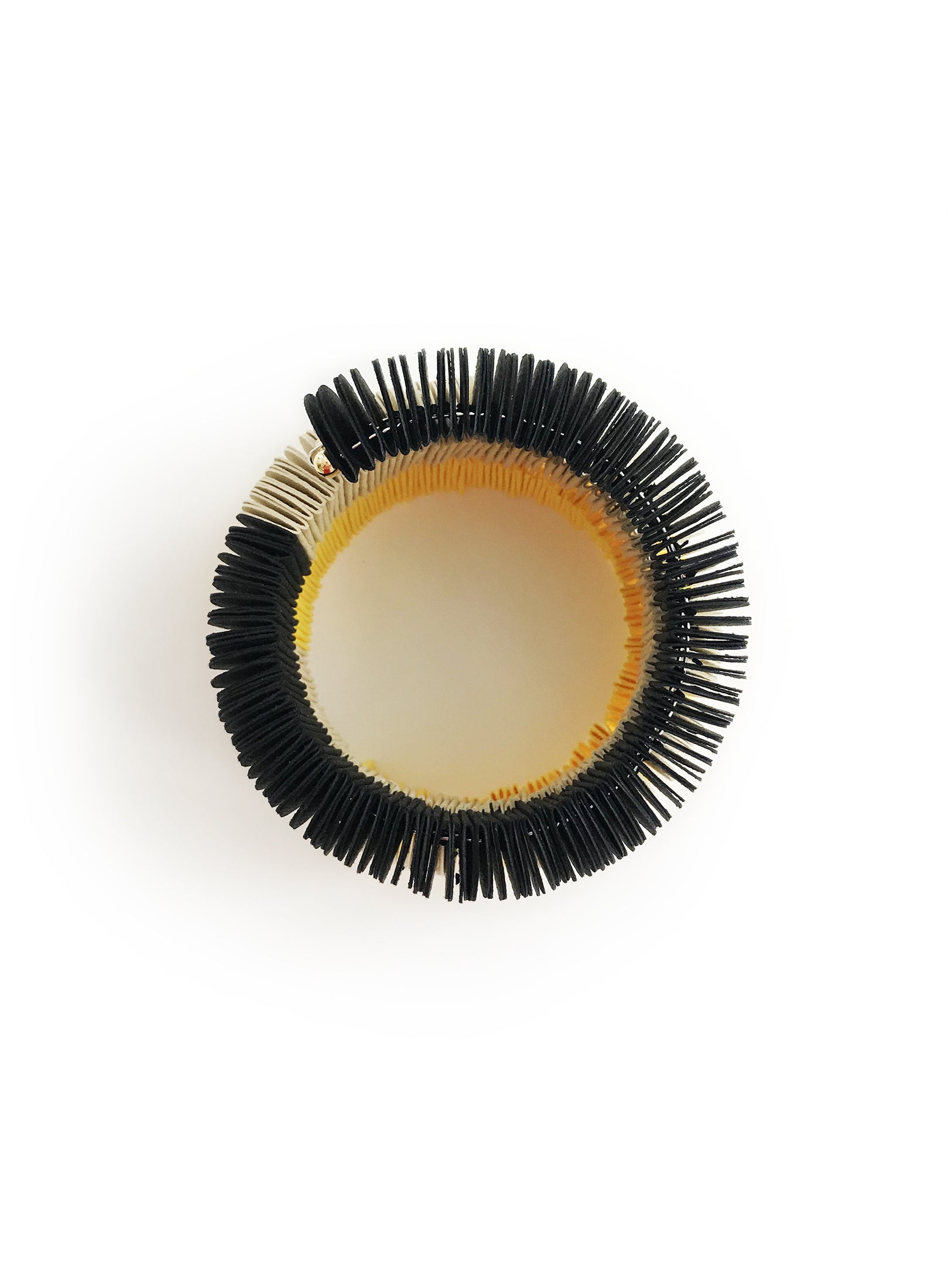 È realizzato a mano con centinaia di piccoli elementi di carta, infilati uno ad uno su un doppio cavetto d’acciaio per garantire resistenza, flessibilità e una linea armoniosa.